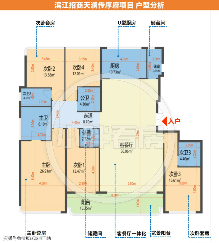 整体客餐厅南北通透,带有家政间,光从户型图来看入户无独立玄关,两梯两户的情况下,其实也可以把鞋柜等做到门口,或者视客餐厅尺度而定打造玄关柜。