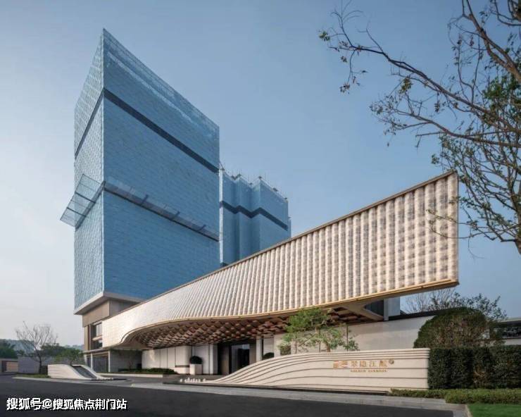 首先,楼盘的主入口是宽约46米、高约9米的阔绰大门,顶部是由约2280片波浪形的水晶玻璃瓦拼合而成的大屋檐,灵感来自“京杭大运河博物馆”。