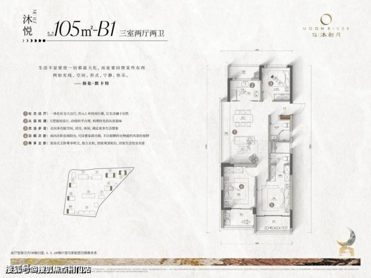 建面约105方户型有两款,一款是“四开间南户型”,每个房间都向阳,还是准双套房。另一款是少见的边套户型,自带约6.1米大边厅,套房主卧,功能性和舒居感兼备。