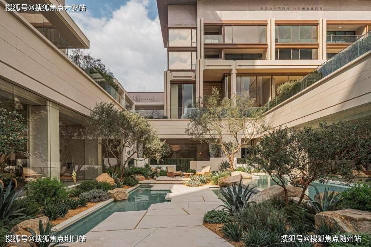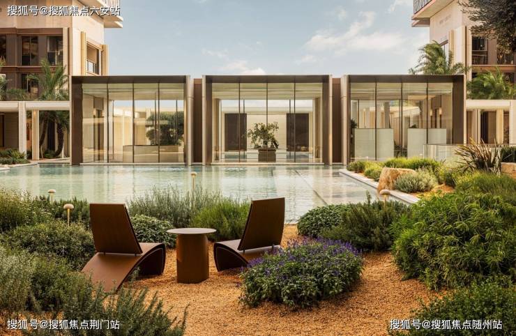 以希腊安缦酒店与Gundari度假村为灵感,引入地中海风情景观,通过莱姆石铺装、冰川蓝水景、沙生植物及20余棵千年油橄榄树,打造沉浸式度假体验。园区色彩采用低饱和度搭配,营造克制而高级的审美基调。
