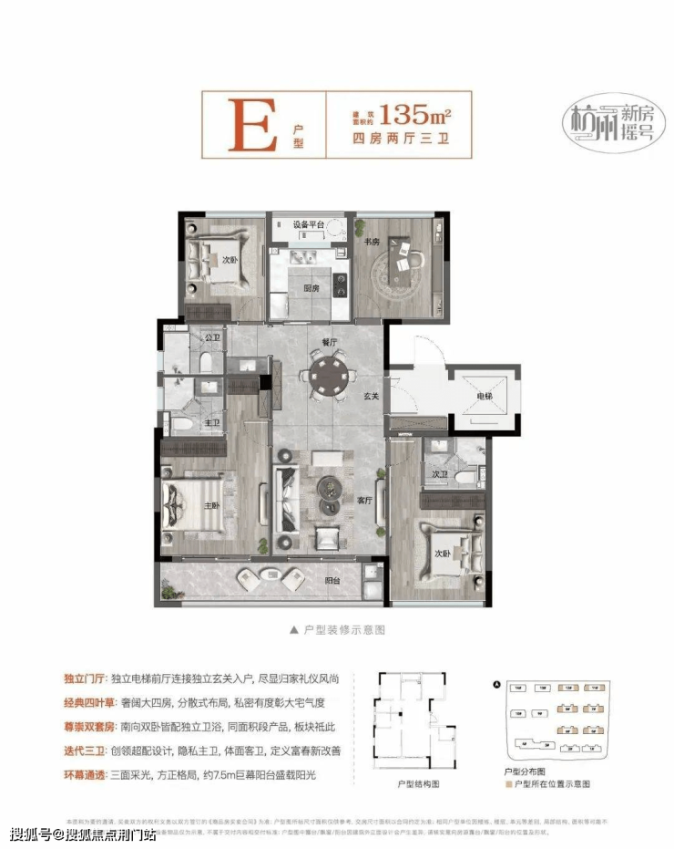 约135㎡户型点评:独立门厅:独立电梯前厅连接独立玄关入户尽显归家礼仪风尚,经典四叶草:奢阔大四房,分散式布局,私密有度彰大宅气度,尊崇双套房:南向卧皆配独立卫浴,同面积段产品,板块祗此,迭代三卫:创领超配设计,隐私主卫,体面客卫,定义富春新改善,环幕通透:三面采光,方正格局,约7.5m巨幕阳台盛载阳光