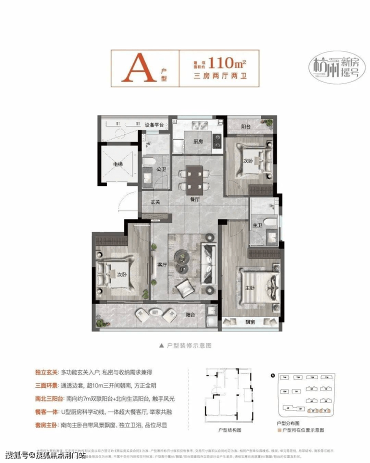 约110㎡户型点评:独立玄关:多功能玄关入户私密与收纳需求兼得,三面环景:通透边套,超10m三开间朝南,方正全明,南北三阳台:南向约7双联阳台+北向生活阳台,触手风光,餐客一体:U型厨房科学动线,一体超大餐客厅,举家共融,套房主卧:南向主卧自带风景飘窗、独立卫浴,品位尽显