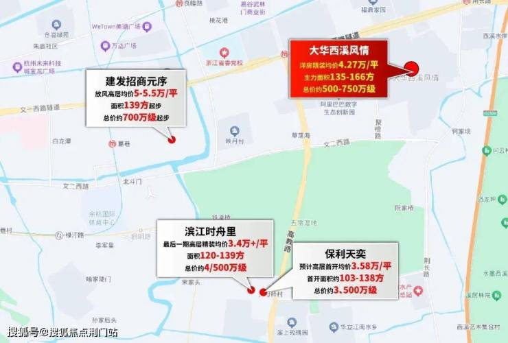 首先是新房:目前大华西溪风情周边还有3个可售项目,分别为刚刚官宣案名的建发招商元序,即将首开的保利天奕,以及最后一期尾房在售的滨江时舟里,分布如下: