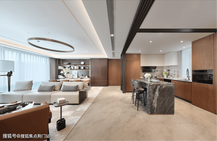 公建化的立面,四面铝板搭配大面积玻璃,阳台统一封包,底层的浅色天然石材还被打磨出弧线,脱去厚重外壳,轻盈洒脱。