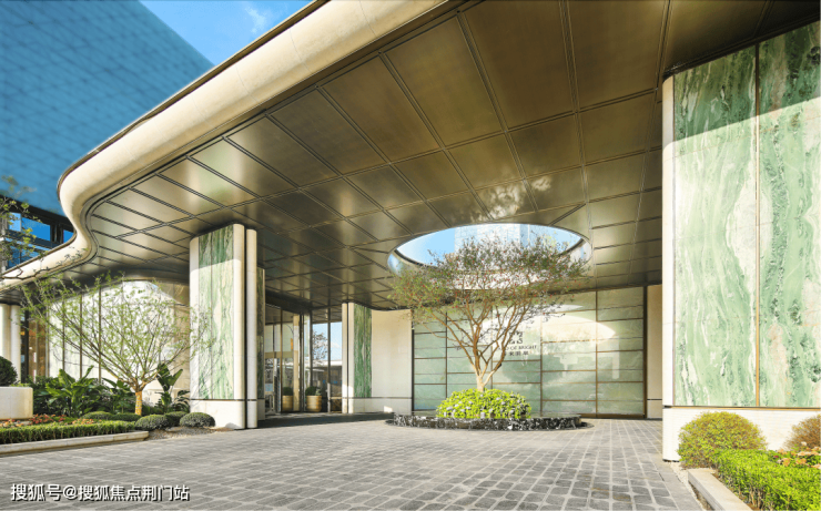 约7米高的主入口,把贝金米黄石材、维多利亚绿等名贵石材,与古铜色金属板、紫薇等名贵草木巧妙搭配、相得益彰,犹如穿着翠绿华服的翩翩公子,透着一身贵气。