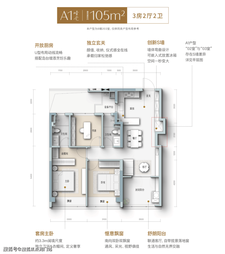 两间南向套房,男女主人和父母都有自己的私人领地,互不打扰。主卧L型转角飘窗,尽可能地室外景观引入;带窗的独立衣帽间,哪个女主人能不爱呢?