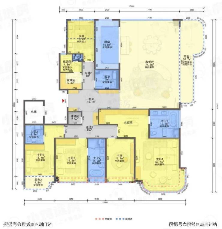 ❶高层建筑面积约496㎡户型,7房2厅6卫,3梯2户,含赠送得房率约94%。