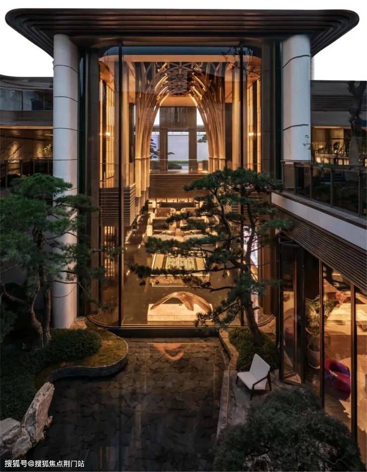 景观以「四境四巷」铺陈东方礼序,「五重归家」轴线串联宽约128米恢弘门庭、约15米叠石飞瀑、约13米榫卯转译的现代穹顶等。约1300㎡下沉式庭院采用三层立体观景设计,15米叠石飞瀑再现《溪山行旅图》的山水意境。