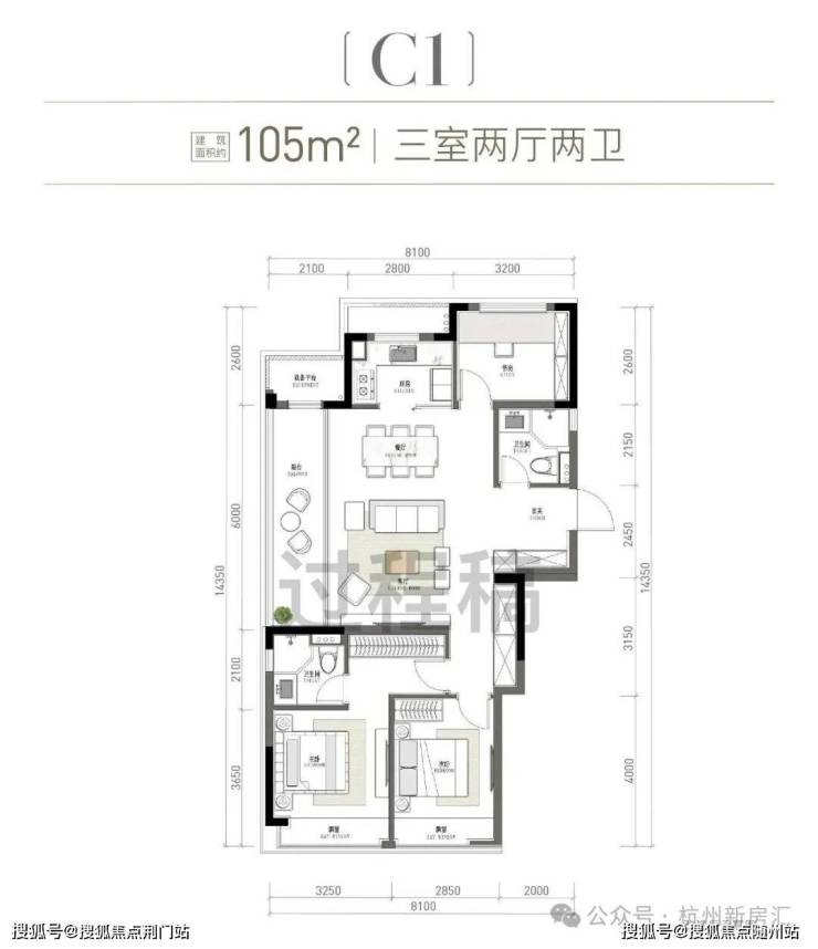 刚改旗舰边套户型:建面约114方四房两卫。
