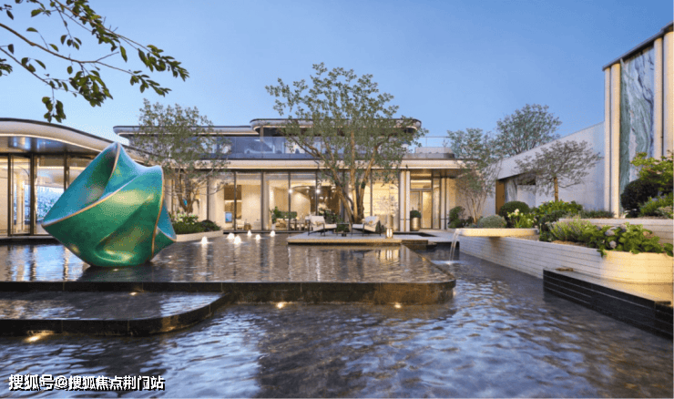 社区主入口是超宽幅门头,宽约 80m 高约 7.1m,两侧的维多利亚绿奢石以及中央的白雪公主透光石很吸睛,浅色的部分则是贝金米黄石材,圆弧的工艺处理也更显温润及价值感,中央栽植的超大紫薇树拥有约60年树龄,底部则是采用宝格丽黑奢石作为基座