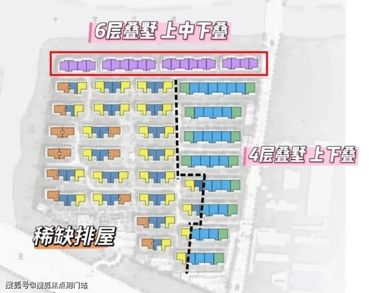 4层叠排为上下叠,6层叠排为上中下叠。外立面效果图上看建筑线条简洁利落,顶部勾勒飞檐翘角,与周边自然景观呼应,强化了低密产品的度假感。