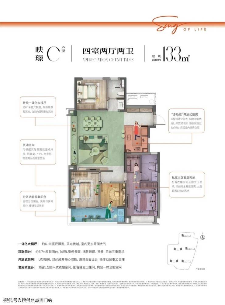 约133㎡户型点评:约6.1米宽尺飘窗,采光优越,室内更加开阔大气,约5.7米双联阳台,加设L型俯景面,满足晾晒、赏景、采光三重需求,U型厨房,封闭敞开随心切换,高效台面设计,操作动线更加合理,预留L型步入式衣帽空间,配备独立卫生间,构筑一席全能空间!