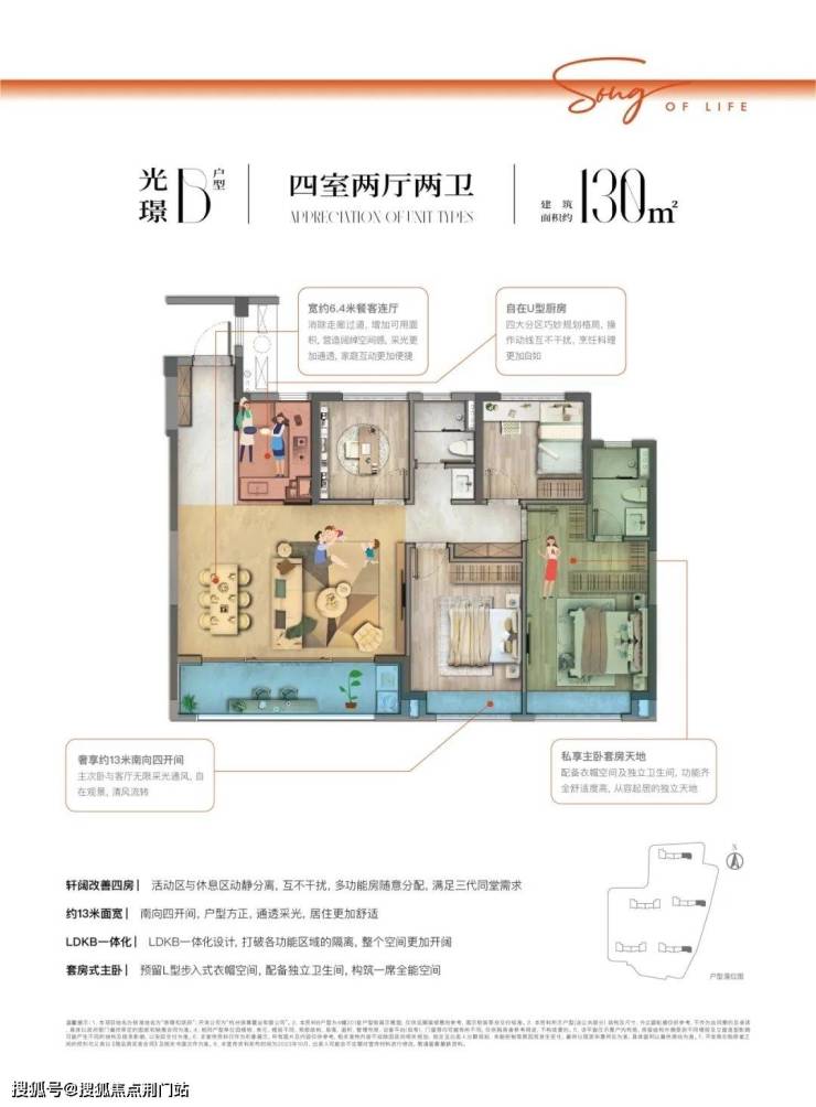 约106㎡户型点评:双联阳台约6.7米面宽,加设L型俯景面,满足晾晒、赏景、采光三重需求,LDKB一体化设计,打破各功能区域的隔离,整个空间更加开阔,开放式厨房 U型厨房,封闭敞开随心切换,高效台面设计,操作动线更加合理!