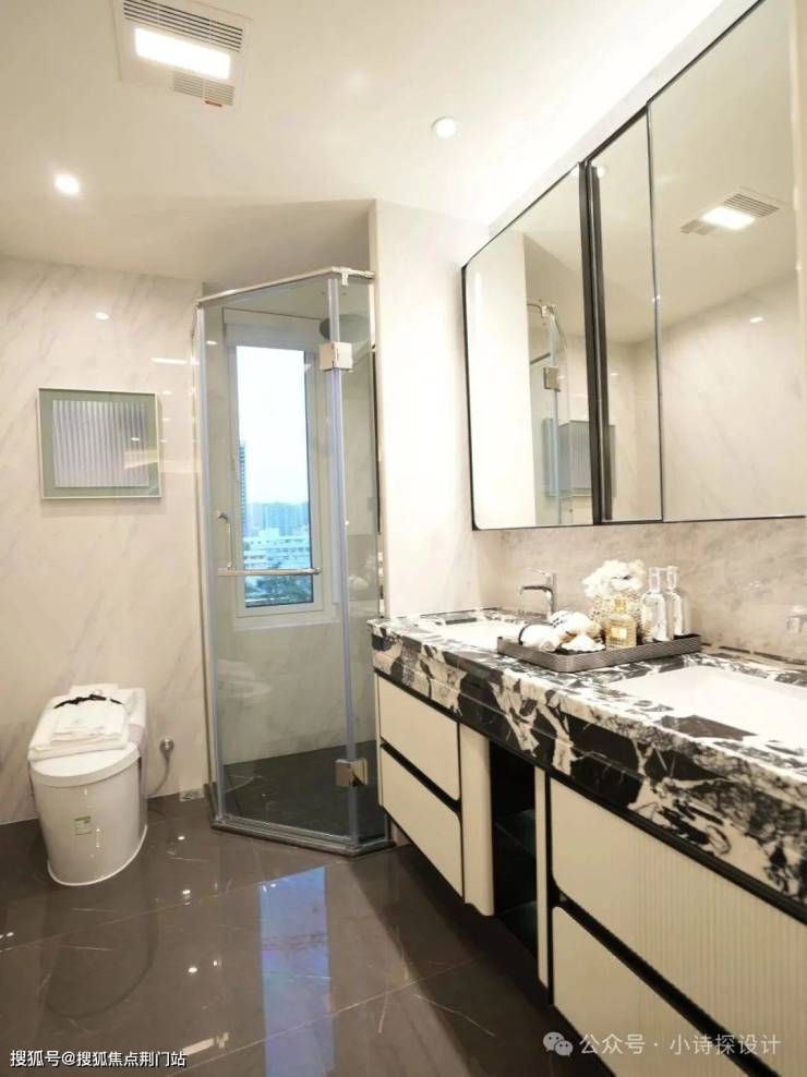 看了一套楼王168㎡~南向开间达到了约15m三卧室朝南,还有2个是套房设计还蛮好的。主卧尺度很大,卫生间用了宝格丽黑奢石双台盆