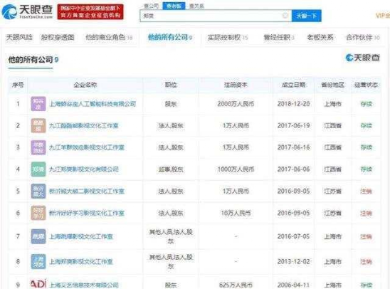 除此之外,据天眼查显示,郑爽名下共有9家公司,在其中6家公司任法定代表人,并实际控制着15家公司。