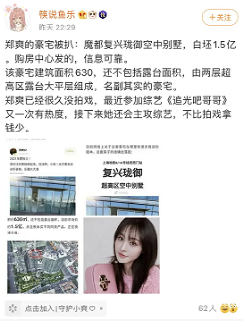 另外,郑爽也多次在节目上大聊自己的购房史,毫不避讳地提起自己对购房的各种欲望。