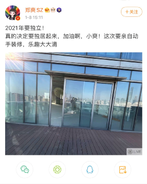 1月8日下午,郑爽在微博上晒了一张自己的独居新家露台照,结果就被眼尖的网友扒出了豪宅所在。