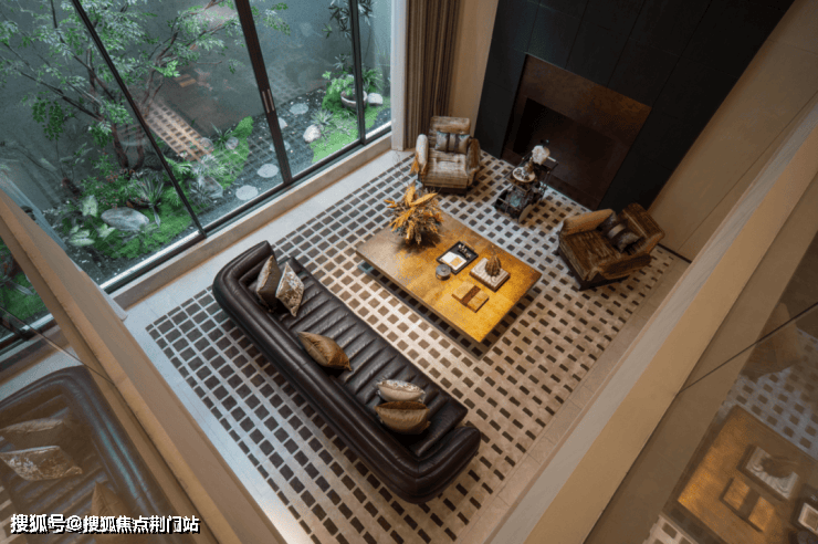 地下恒温泳池三面采光,顶部是15米玻璃天顶倒映着空中花园水景,泳池底部300万片马赛克拼出名画《睡莲》局部。两侧黑色铁艺屏风外是下沉庭院,让业主在游泳的同时也可看到外部的自然景观。