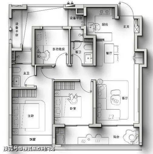 再看建面约117方四房户型,克制的面积实现四房两卫全功能之外,细节同样饱满,玄关双储物空间、双设备阳台、南向双联大阳台一应俱全。