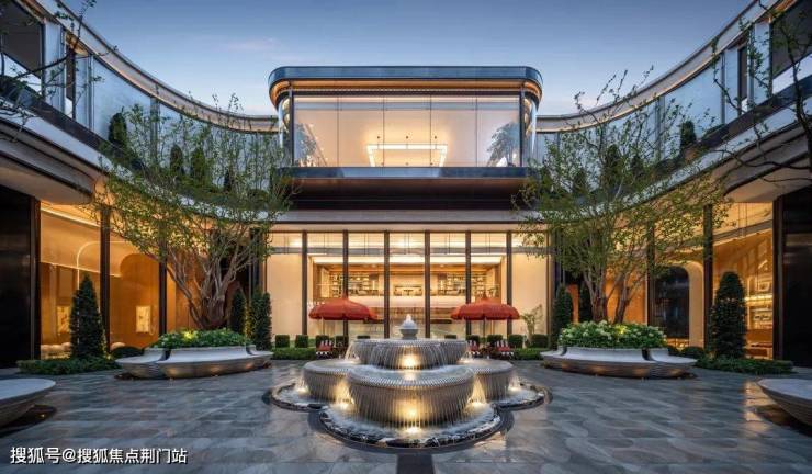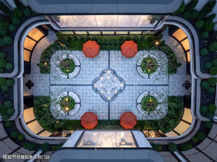 逐级而上,浅色石质喷泉与层叠绿植花坛相映成趣,借3米台地高差形成阶梯式景观序列,于起伏地形间勾勒出悠然意境。