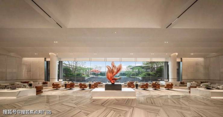 行至大堂,全景落地窗外漩光泳池碧波荡漾,倒映天光云影,泳池被绿植环抱宛若“绿洲岛屿”,瞬间将都市焦虑转化为度假松弛感。