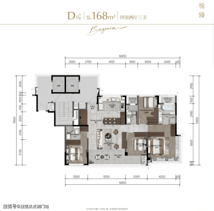 建面约168㎡四房两厅三卫,总价约516-624万。