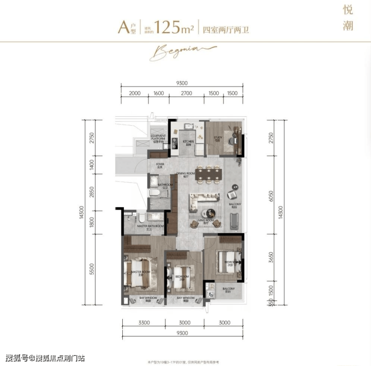 建面约125㎡四房两厅两卫中间套,首开起步总价约339万。