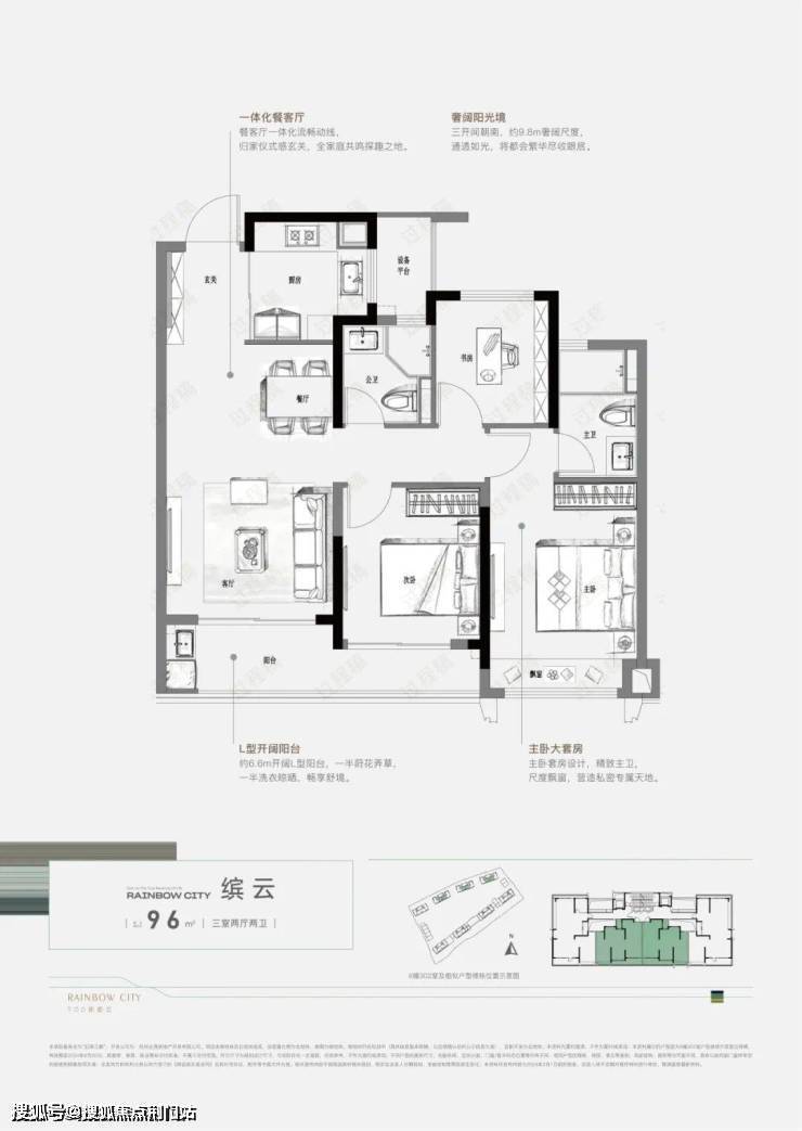 建面约96㎡的3房户型,总价维持在170万起的低门槛,对新杭州家庭价格也是难得友好的门槛,同时还把实用性做到了MAX,约9.8米的南向尺度让一体化餐客厅与两间起居室都沐浴在充沛的自然光下。