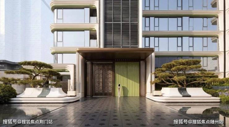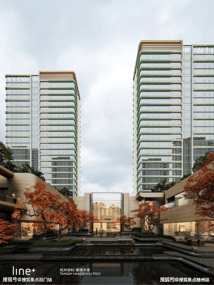 保利·奥博天珺的建筑外立面,依然是非常杭州的表达。镶嵌在繁复线条中的绿色陶板,用造价昂贵的曲线,刻画出了龙井春芽的神韵。