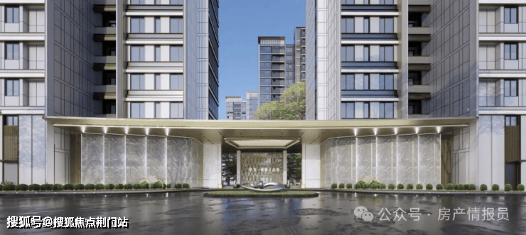 》酒店式归家体系:港湾式落客区、约35米长卷府门、度假感景观水池