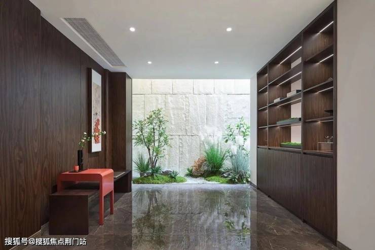 礼序中庭 山水观心府门承袭中式府邸的传统对称性布局,再现温润如玉的礼序空间,温润优雅 艺术行旅以黑白色为主基调,陈设杭州非遗铜刻,串联龙坞茶园美景,带来非凡艺术盛宴