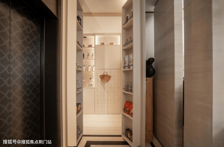 拾级而下的主卧套房,像被温柔包裹的梦境。接近5米长的衣帽间里,皮革门板缀着夹丝玻璃,柔和灯光漫过分区收纳的衣物,连梳妆镜都闪着细碎的光。
