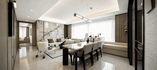 从室外风景到室内精装,大面积木饰面搭配“芬迪白”岩板背景墙,铺展出纯净北卧的浪漫气息,直接将空间从舒适型升维至奢享型。再加上中央空调、地暖、新风系统三大件奢配,四季恒温恒湿,舒适无需等待,实现改善一步到位。