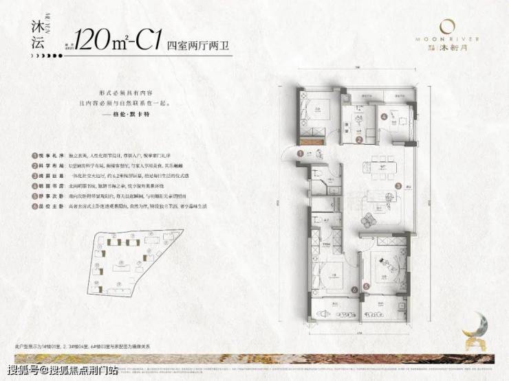 波光为笺,树影成诗沐新月是继沐晴川、沐云川之后,M55产品系列的第三个作品。沐新月府因地制宜,旨在打造96~135㎡水岸小高层,以林汐美学为源点,承袭大水院美学、夜行者美学、漂浮美学等经典元素,环绕建筑的都会森林、环绕园林的美学潮汐、环绕水景的漂浮岛屿的三重景观美学。