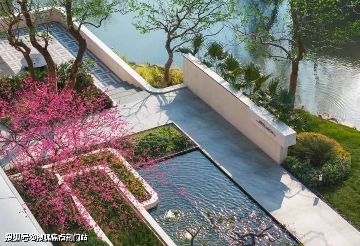 很多楼盘水池铺的都是瓷砖马赛克, 但它却用上了意大利卡拉卡白大理石,将池水衬出梦幻的蒂芙尼蓝。池边摇曳着油橄榄树、造型紫薇,高级感丝毫不逊现在那几个网红豪宅。