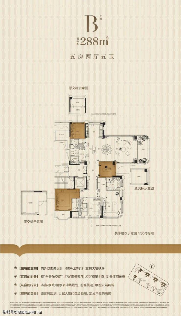 户型特点:双阳台、四个套房带独立卫生间且三个房间朝南,考虑到了三代同堂和理想生活场景。