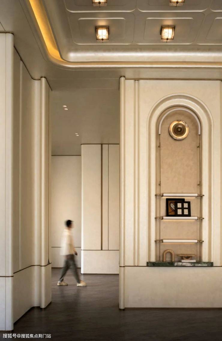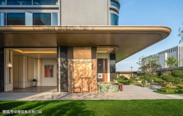 时舟里大门气势恢弘,利用地上架空车库的做法,打造了约9米高的双层高大门,鎏金天幕铺开,横向70米宽的尺度让入口的空间气场拉满。