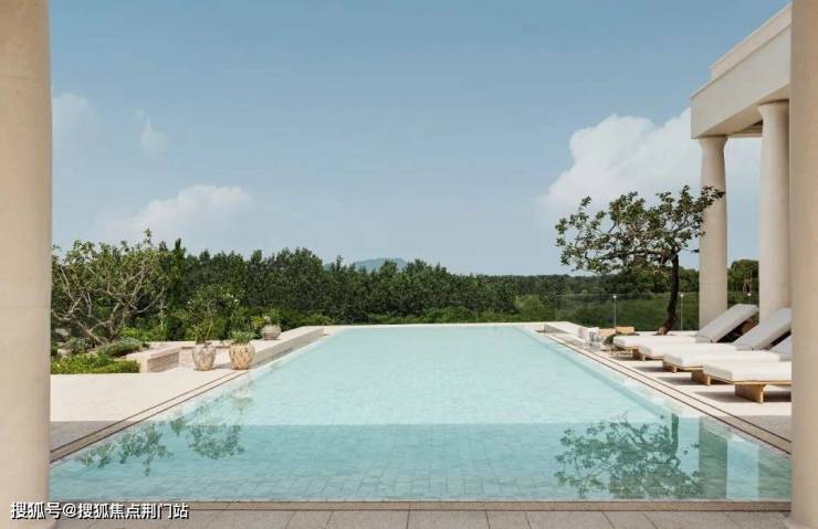 悬挑在三层的无边镜面戏水池,同样是精妙地抬高到逾9米。当你坐在廊柱下,当你漫步在戏水池旁,它会隐藏起整片城区,惟独把群山留在你的视野里。他们是用富有想象力的空间算法,把群山精确地放进柱廊;用富有诗意的超常规悬挑,让「湖水」荡漾在空中。
