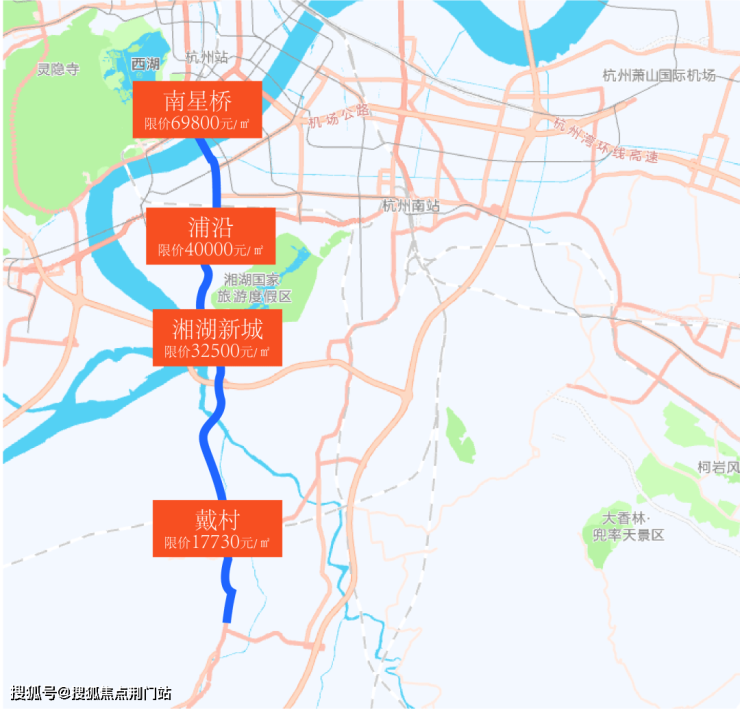 而南端的戴村,「主城半小时生活圈」内,精装限价却只要17730元/㎡。 不过几脚油门,购房成本就可以省出5万/㎡+。沿途的浦沿40000元/㎡、湘湖新城32500元/㎡,单限价就比戴村贵1.8-2.3倍。总价算下来还要高出一大截。
