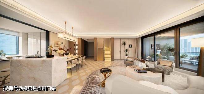 在约268㎡户型中,约3.15米层高搭配全景玻璃幕墙,把钱塘江景和社区五重园林“框”进家里,即使在客厅角落,也能看到江风拂过树梢。