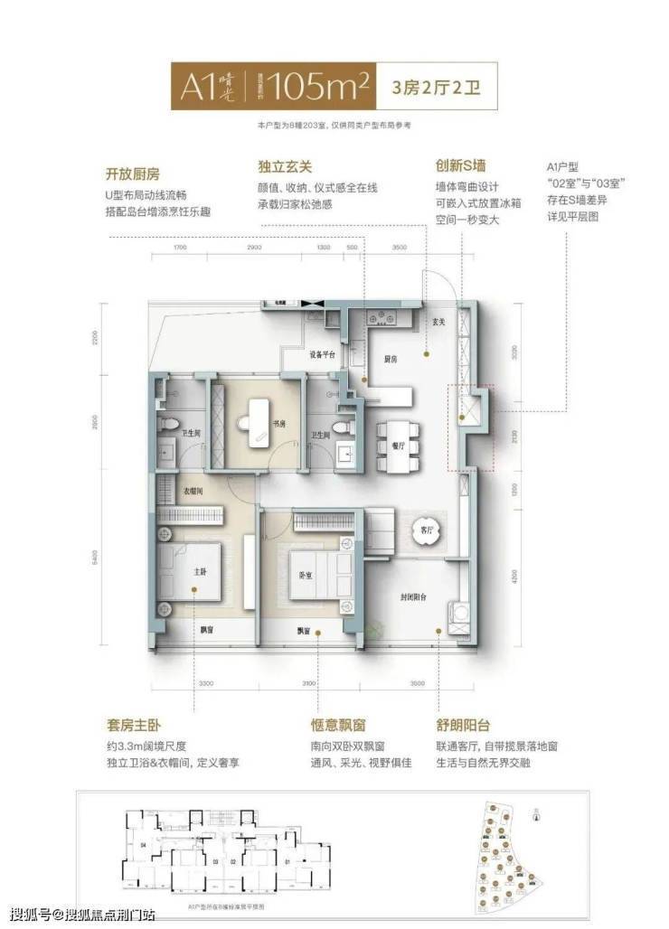 建面约105㎡晴光户型,不仅实现更优面积排布,更做到精神与审美的高度适配。在设计中,这间三房同样拥有南向大面宽,搭配S墙/开放式厨房/一体化餐客厅/多功能书房/酒店套房主卧等,将整个空间的开阔感和互动性做到极致,满足居住者对舒适、安逸的“精准需求”。