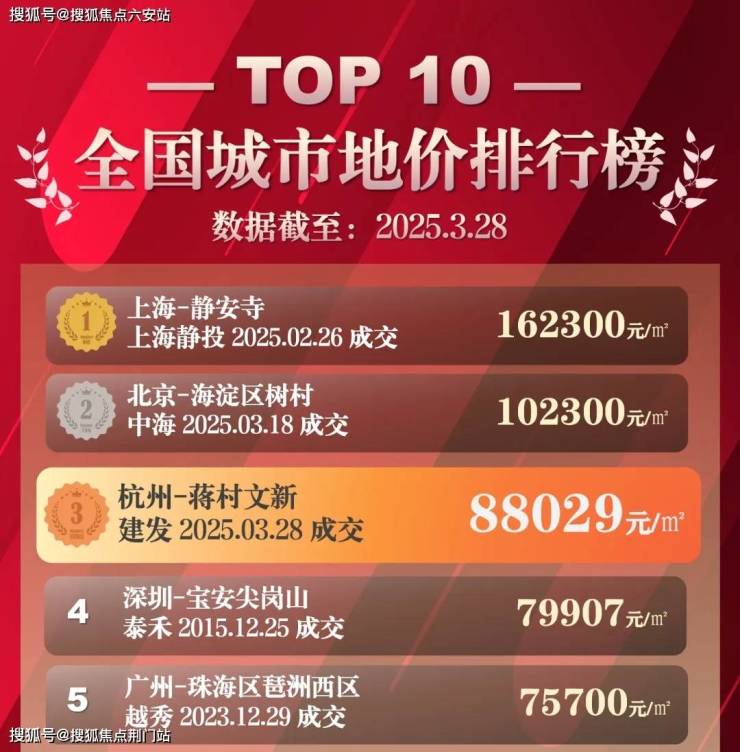3月25日,滨江水电新村地块以7.74万/㎡的楼面价刷新了纪录;短短三天后,蒋村低密宅地更以8.8万/㎡的价格将杭州推进全国地价TOP3。