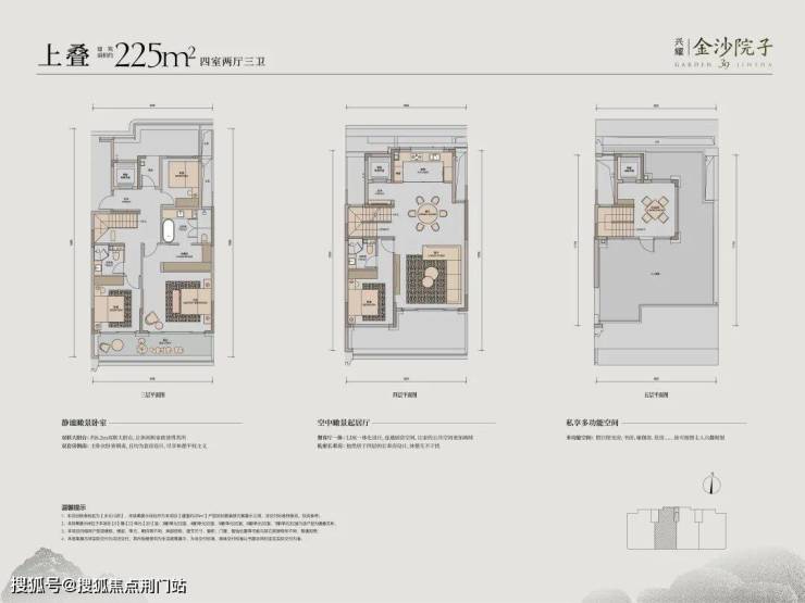 项目所在地块容积率仅为2.5,天生承载“高低配”。高层户型建面约96-145㎡;叠墅户型建面约199-255㎡。金沙院子——兴耀首个超级院墅,上下双叠。上叠面积255方,下叠约245方,最小花园115方。