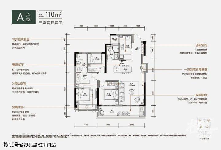 约110平方米的户型通过动静分区的设计理念确保了生活的有序,三个朝南的开间和阳台设计保证了优越的采光,每缕阳光都能照亮家中每个角落。同时,两个卫生间的设置有效解决了家庭成员早间排队的问题。
