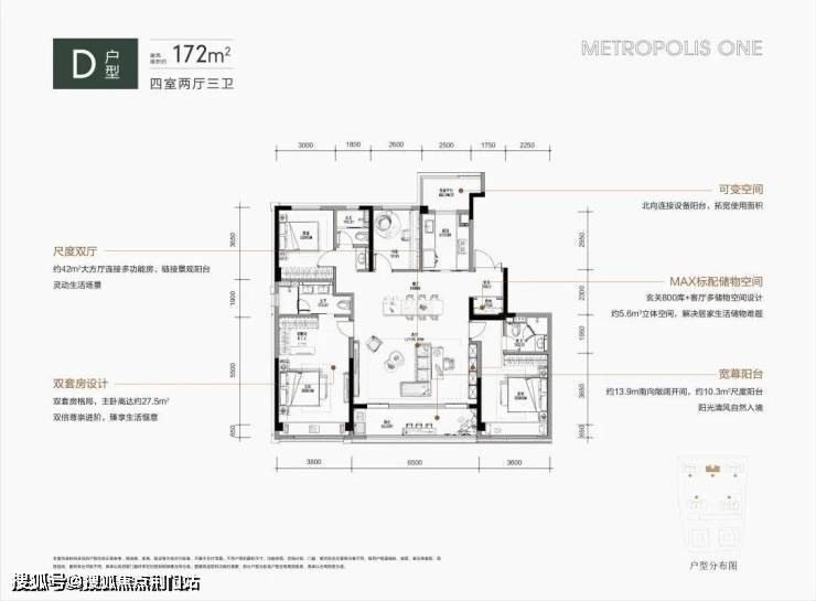 约172平方米的户型体现了生活的极致表达,其配备宽敞的大厅和跑道式阳台,四开间朝南和双套房的豪华设置使其在同类户型中突出。特别是厨房靠近客厅一侧的餐厅布局,使厨房成为家庭生活和社交的中心。