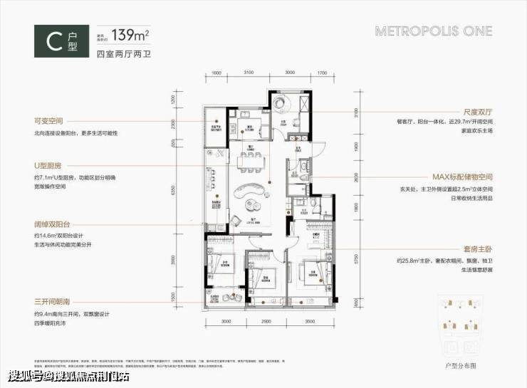 约139平方米的户型则展示了对生活品质的追求,宽敞的大厅设计让居室显得开阔,双阳台和双飘窗的设计巧妙地分隔了生活与休闲区。这样的环境使得每天的居住都成为享受。4室2厅2卫餐客厅阳台一体化,近约29.7㎡开阔空间,9.4m南向三开间,双飘窗设计约25.8㎡套房式主卧奢华衣帽间