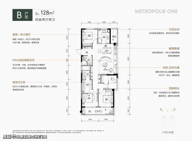 约128平方米的户型提供了宽敞舒适的居住体验。其四房边套设计不仅优雅且实用,餐客厅一体化布局配合飘窗,不只拓宽了视野,还为家庭聚会创造了理想空间。在此,无论是家庭成员间的互动还是与朋友的欢聚,都格外温馨和谐。