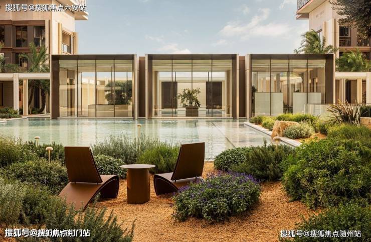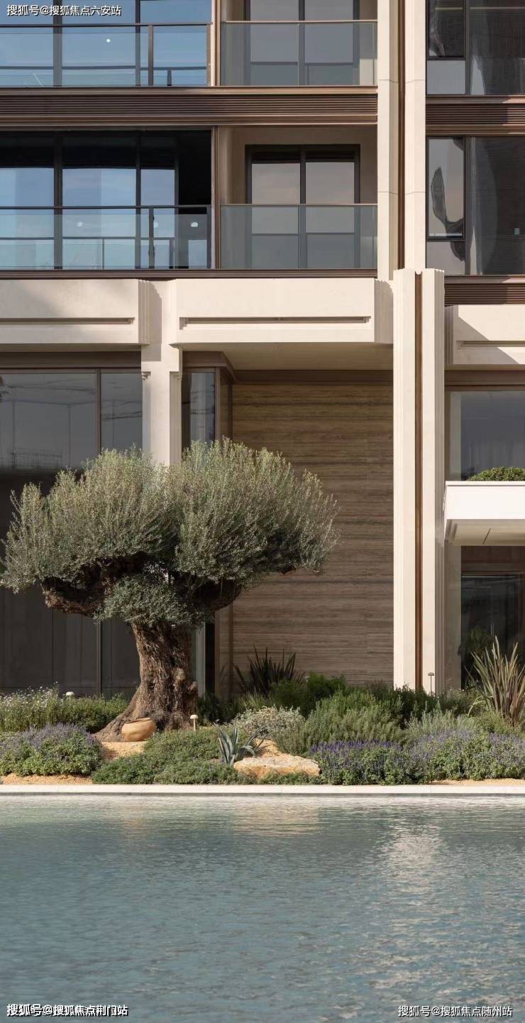 以希腊安缦酒店与Gundari度假村为灵感,引入地中海风情景观,通过莱姆石铺装、冰川蓝水景、沙生植物及20余棵千年油橄榄树,打造沉浸式度假体验。园区色彩采用低饱和度搭配,营造克制而高级的审美基调。