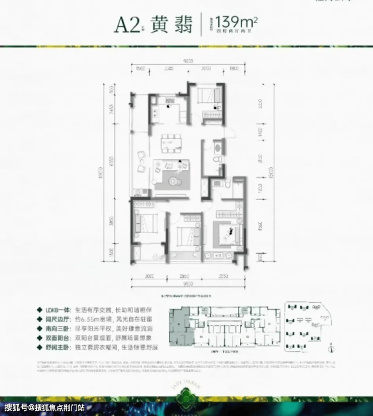 A户型:约139㎡户型,四房两厅两卫,三开间朝南,全明边厅设计,大横厅带大阳台,采光视野好;三个卧室均朝南,带阳台或飘窗,面宽大、采光好;主卧大套间、阔绰收纳空间。是绿城过往的项目中难以见到的。餐客厅一体,连带一个约6.35m左右阳台,景观视野堪称一流。