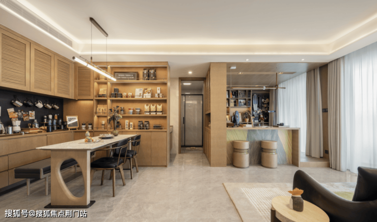 在湖与舍, 每幢均设约4.5米高的架空层。潮流家具点缀, 木饰墙、水磨石凳和金属吧台穿插,就像来到一处高雅的咖啡馆。